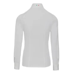 Horseware AA Porto Competition Shirt has a full length covered button placket with small AA embroidery logo just below the bib. With its lightweight, silky feel and weight it is easy to tuck into breeches and for comfort under a show jacket. The back of the white straight edge wrap collar has a small embroidered bar with green/white/red colors of the Italian flag. The collar, placket, and cuffs deliver traditional show ring style.
