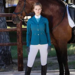Horseware Competition Jacket in gorgeous Hydro blue! Ladies softshell competition show jacket is lightweight and breathable for total riding comfort. This stretch jacket from Horseware Ireland is highly water-resistant and stain-resistant to stay looking sharp round after round. Women’s riding jacket has that close-fitting, athletic look you want with a carefully engineered construction for maximum movement and flattering drape.