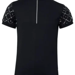 Horze Kids Fia Short Sleeve Shirt is absolutely perfect for summer riding with its lightweight micropolyester fabric and metallic accents that shine in the sun. Girls short sleeve polo style shirt has a mock collar and quarter length zipper. The fabric is a pique knit while the sleeves are smooth with pique cuff bands. The sleeves have a silver checked pattern on with little Horze logos.