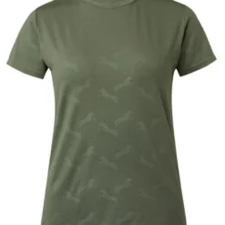 The Horze Nina shirt has soft, breathable material to keep you comfortable and a versatile color to easily pair with breeches, jeans, and riding tights. A small Horze emblem is printed at the left sleeve and hem. Horze Nina Tech Horse Print Tee for summer horse riding is beautiful in Olive Green and Pond Blue.