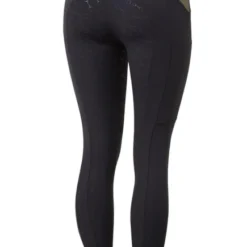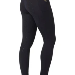 Horze Sagira Full Seat Tights have a golden shimmer panel in back that adds a fun glam touch to practical riding tights. The metallic curved panel in back is flattering, too. Women’s silicone grip pull-on tights are breathable and lightweight for summer riding comfort.