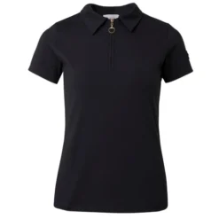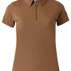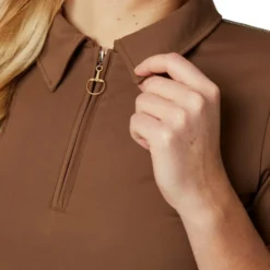 Women’s Sagira Training Shirt with quick dry, breathable fabric has a classic fit with feminine sleeves and tailoring. The covered quarter length placket has a gold zipper and bit pull. The shiny fabric and dark colors give the Sagira Shirt a sophisticated upscale look. This is an especially lovely shirt for upgrading your riding wardrobe and is ideal for summer training. Mary’s has the Horze Sagira Quick Dry Shirt in Dark Bison Brown and Dark Navy Blue.