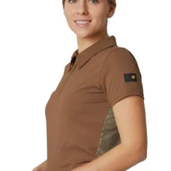 Horze Sagira Quick Dry Top has elegance and function for riding top perfection! Ladies short sleeve Sagira Quick Dry Shirt has golden shimmer fabric in back that add a rich contrast to the Dark Blue and Brown shirt colors. It’s lightweight, stretchy, and breathable as well as chic. The Quick Dry fabric is moisture wicking and helps keep you dry and cooler on summer days.