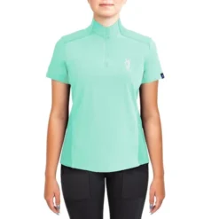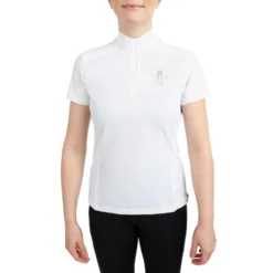 Girls Irideon Luna CoolStretch Short Sleeve Shirt has extra stretchy IceMesh perforated fabric on the back, sides, and shoulders to allow greater airflow. The curved back hem, mock neck, and quarter zip is a favorite training jersey style for equestrians of all ages. Smart and comfortable for horse riding, the Irideon short sleeve Luna Shirt for kids easily works for other sports and summer activities, too.