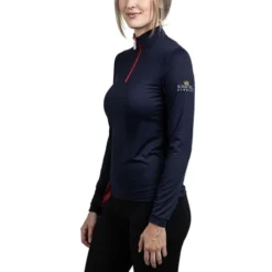 Kastel Denmark Crystal Crown Sun Shirt features the signature Kastel crown logo in gorgeous crystals on the back. The darker colors are great for flattering figures and hiding a bit of barn dirt! The silky technical fabric is equipped with mesh sleeves for extra ventilation. Versatile long sleeve, quarter zip sports top is perfect for riding, hiking, running, tennis, and other outdoor sports.