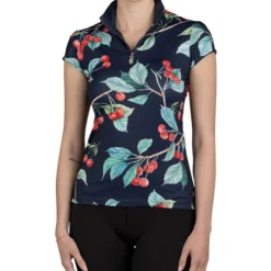 Kastel Denmark Navy Cherry Cap Sleeve Shirt in G has super stretch fabric for effortless range of motion plus UPF30+ for skin protection. A branded zipper pull, navy embroidery crown at the hem, and Danish flag under the back collar add signature Kastel Denmark finishing touches. Enjoy the new Navy Cherry Cap Sleeve Shirt from Kastel Denmark for summer riding comfort with style.