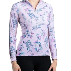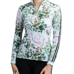 Women’s Kastel Denmark Raglan Long Sleeve Shirt with Trim in new Secret Garden and Lilac Fleurs botanical prints features a sporty stripe down the sleeves for extra style. Kastel Denmark quarter zip riding top is a lightweight, silky shirt with UPF30+ sun protection. The fabric wicks moisture, dries fast, and keeps you cool and comfortable.