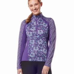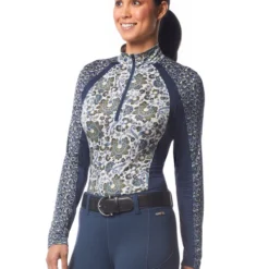 Women’s Kerrits Always Cool Ice Fil Long Sleeve Shirt in beautiful new prints has all the cool, stretchy comfort a rider could want. The combination of Kerrits equestrian prints plus slimming solid panels is sporty as well as flattering. The Ice Fil Lite fabric cools your skin by up to five degrees on hot, muggy days and provides important UPF+30 sun protection. Breezy and lightweight riding shirt is wicking, quick drying, and highly breathable.