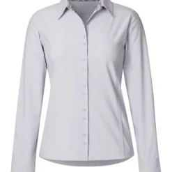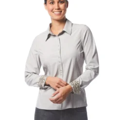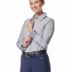 Women’s long sleeve Kerrits Equitate Button Up Shirt has updated, feminine oxford shirt styling in a lightweight stretch fabric. The micro-striped fabric and floral collar and cuff trim add to the fresh look. Princess seams and a fit that follows body contours without being fitted create a flattering and confident look in the saddle. Strategically placed double buttons prevent gaps. The Equitate Button Up Shirt has a shirt tail hem that stays in place when tucked in and button cuffs on the long sleeves.