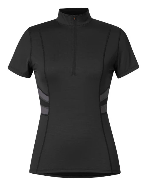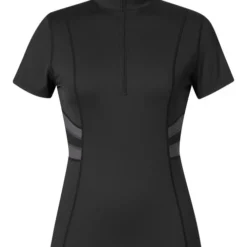 Women’s Kerrits Trot On Tech Top has short sleeves and silky smooth lightweight technical fabric for breathable, moisture wicking comfort. Ladies quarter zip riding top stretches easily and follows the contours of the body, with an overall athletic and feminine silhouette. Sporty contrast side panels with mesh inserts are slimming as well as cooling.