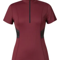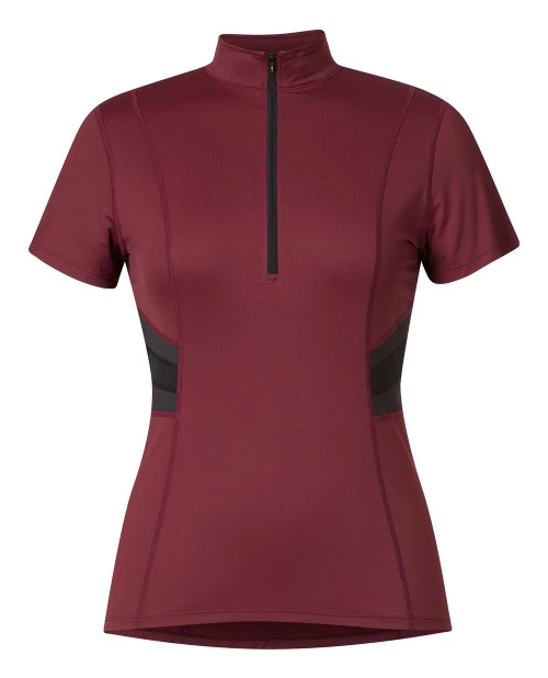 Kerrits Trot On Tech Top features seven-inch sleeves and the perfect hip length that can be tucked in or worn loose with good cvoerage. When zipped up completely the mock collar neckline covers that sun-sensitive area. Super stretchy Trot On Tech Top from Kerrits has UPF50+ sun protection and comes in versatile Sangria and Black colors.