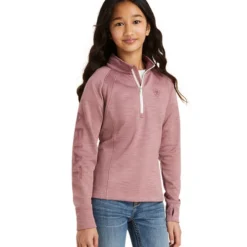 Ariat Kids Tek Team Half Zip Sweatshirt is a mid-layer shirt with practical versatility and beautiful style. The pleasing colors set the tone for this Ariat equestrian fall/winter top that’s ideal for busy barn girls. Sporty styling and contrast color accents make this girls’ sweater sophisticated and easy to wear anywhere. The Tek Team Sweatshirt is a half zip style with mock neck and seamed panels. Ariat’s very lightweight Stretch Tek material with microfleece backing delivers coziness inside.