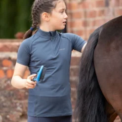 Aubrion Revive Short Sleeve Sun Shirt for girls will coordinate with so many colors of breeches and tights thanks to the pretty Peony print in shades of navy and olive. It’s great at hiding barn dirt, too! If your rider prefers a solid color, Navy is wonderfully versatile, too, and looks great in any season. The technical stretch fabric is rated UPF50+ and is lightweight and breathable. Summer-ready Aubrion Revive Sun Shirt is perfect for the equestrian kid who wants riding clothes that fit great and are comfortable enough to wear all day.