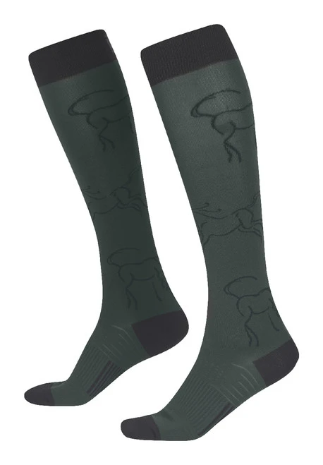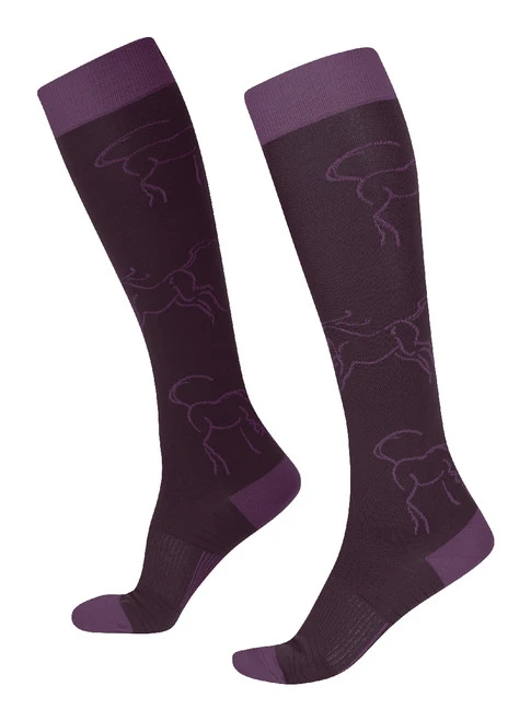 Kids winter riding socks feature a Kerrits exclusive Winter Whinnies pattern of playful horses. Soft and stretchy knee socks have a non-binding cuff, reinforced heel and toe, and are thin enough to wear with favorite boots. Kerrits Kids Winter Whinnies Wool Socks are tough enough for a busy barn life. Choose from seasonal colors that coordinate with Kerrits breeches and tops. Kids Winter Whinnies Wool Socks are one size to fit most young riders.