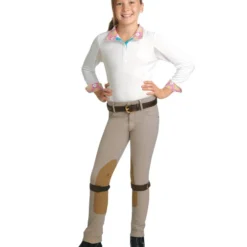 Kids International Jods will fit great, flatter, and perform beautifully. Children’s show breech has a low rise and straight fit with Euroseat. Elastic straps button inside the cuff for a secure fit around the foot. They are easy care machine wash – line dry for greater durability. Classic Beige. Kids love wearing Romfh apparel for lessons, schooling, and shows because it is made with the same attention to detail as the adult apparel.