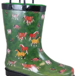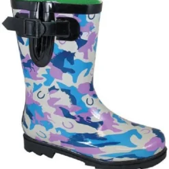 Kids Rubber Rain Boots from Smoky Mountain Boots are barn-friendly boots that are perfect for rainy days or horse bathing. The Southwestern design rubber rain boots for children are waterproof boots with sturdy pull-up loops at the top to make it easier for little hands to tug them on. The Hidden Horses and Solid Purple style have an adjustment tab at the side.