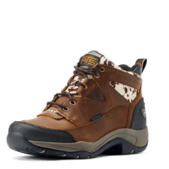 Smoky Mountain rubber boots in youth sizes have slip resistant lug soles to help grip on wet, slippery surfaces. There’s a sock lining inside for comfort. The Riverbend style is tan with a southwestern print in shades of turquoise, red, and chocolate. The pattern consists of geometric shapes and horses. The Hidden Horses style has horse shadows in purple and blue. All styles of Smoky Mountain Rubber Rain Boots for kids are useful and colorful enough to brighten a grey, rainy day.