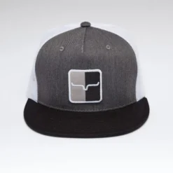 Kimes Ranch Mirror Trucker Hat is a high profile Tall Boy cap with flat bill and cool mesh back. It features a patch with the Kimes horns logo with a light grey/dark grey divided background. The Western casual baseball cap will shade your face and protect your head from the sun in style.