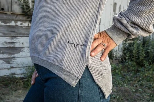Kimes Ranch Portales Thermal Crew is soft and breathable with its cotton/poly stretch blend fabric. The front hem is slightly shorter and there are deep side vents. The heavy acid wash makes the Wine and Slate colors softer and more muted. Kimes Ranch small embroidered horns at the chest add a signature Kimes finishing touch.