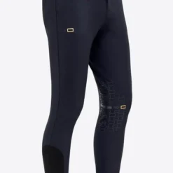 RG Men’s Knee Grip Riding Breeches from Rider’s Gene at Cavalleria Toscana have a comfortable and flattering fit plus classic style with a contemporary twist. The technical stretch fabric is wicking, fast drying, and supportive. Men’s riding breeches from RG Rider’s Gene in Navy and Grey feature RG logo print at the knees for flexible grip in the saddle.