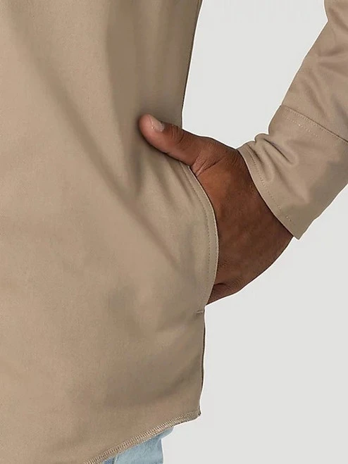 Wrangler Flannel Lined Work Shirt will help get you out the door on a chilly morning. This roomy work shirt has convenient hand-warming pockets on the sides. The overlock stitch at the lower edge means no bulky hem, so the Wrangler Flannel Lined Work Shirt can be tucked into jeans or work pants. The Dune color twill and red/cream plaid flannel lining are excellent neutral colors to fit right into your work, riding, or casual wardrobe. Easy to wear as a shirtjac, too, the Wrangler Flannel Lined Work Shirt is made for men who need to work, ride, and move comfortably in colder weather.