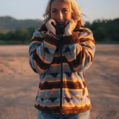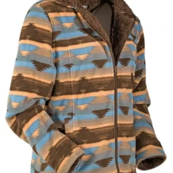 Outback Trading Company Dawn Fleece Jacket offers warmth and flattery with the softest fleece inside and out. The polar fleece outer and sherpa fleece lining combine for excellent warmth while the bold Southwestern pattern in gorgeous colors is a knockout! Women’s cold weather zip up jacket for riding and everyday fashion is a medium weight and super cozy!