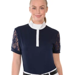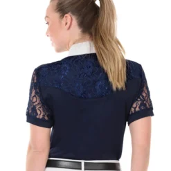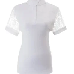 Women’s Elegance Lace Short Sleeve Show Shirt balances the feminine and sporty with performance fabrics and soft lace sleeves. Ladies short sleeve horse show shirt has a white covered placket and wrap collar that snaps closed. The back of the collar has a stock tie loop to give you more showing options.