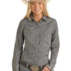 Women’s Western wear Camo Twill Shirt from Panhandle looks crisp and polished in cotton twill. The long sleeve snap shirt is perfect for pairing with vests, sweaters, and jackets, but definitely is a standout on its own! Panhandle Camo Twill Snap Shirt delivers quality construction, sophistication, and a contemporary look, all while staying true to traditional Western style.
