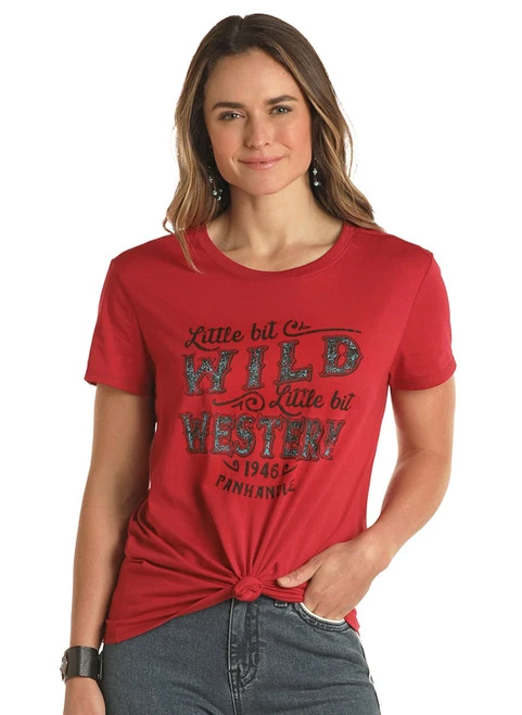Panhandle Little Bit Wild & Little Bit Western Tee is a red short sleeve tee shirt with vintage print on the front. Women’s casual T-shirt reads “Little bit WILD, Little bit WESTERN” and has 1945 Panhandle print underneath. The blue Wild and Western letters in antique font really pop against the red!