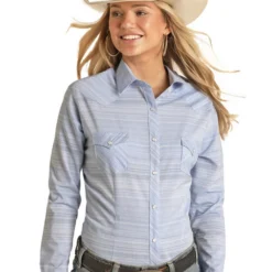 Ladies Aqua Brown Stripe Western shirt is all cotton for cool, breathable comfort. The tapered silhouette and structured fit make it a nice look for showing. Really nice mix of colors for the print! Panhandle Rough Stock Aqua Brown Stripe Shirt has the look and comfort for season-spanning value. Nice shirt for layering when the temperature dips again.