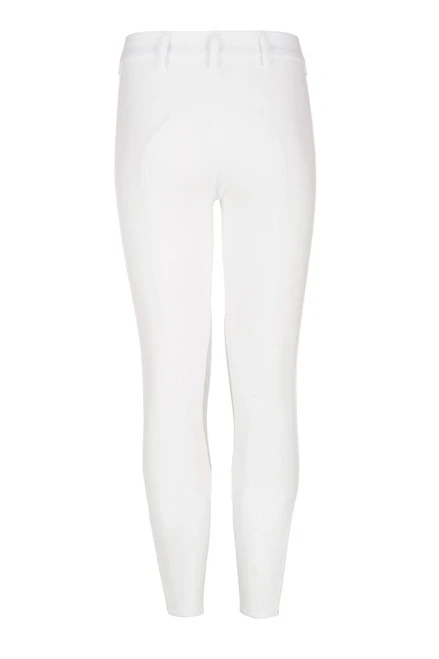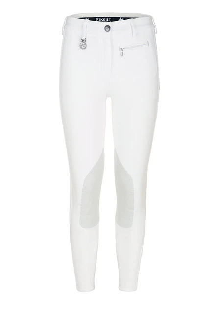 Prisca Knee Patch Breeches for ladies is a luxury riding breech in white, perfect for your show jumping wardrobe. Made from Pikeur’s wonderful stretch fabric that’s 64% cotton/29% polyamide/7% elastane for exceptional fit and fell. Euroseat style with front zipper and slide hook closure. Instantly recognizable Pikeur metal logo hangs from front belt loop. Sleek zippered pocket in front is big enough for credit card, a bit of cash, and a few peppermints. Lower rise in the front with more coverage in the back for proper fit.