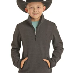The Powder River Kids Fleece Pullover for boys and girls has unisex styling and warm, stretchy comfort for busy ranch and barn kids. The lightweight mid layer pullover sweater has brushed fleece inside and hand warming kangaroo pockets in front. The Kids Fleece Pullover is ideal over a base layer and under vests and jackets.