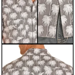 R&R Cowboy Palm Tree Short Sleeve Shirt has a cool tropical feel with classic western elements for unique style. Men’s short sleeve western shirt from Rock & Roll Cowboy has a faded charcoal background with white chalk palm tree print. Men’s western riding and fashion shirt is all cotton for cool, breathable comfort.