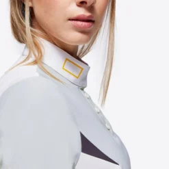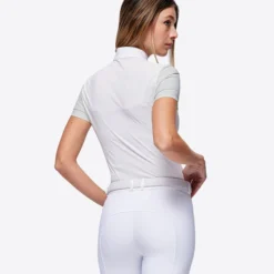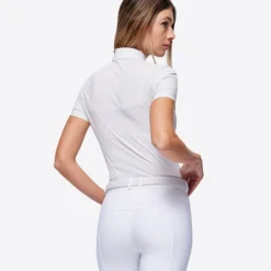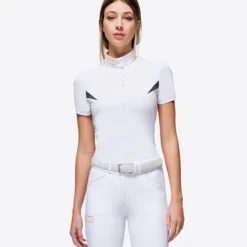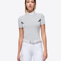 Women’s RG Jersey Short Sleeve Button Competition Polo is silky smooth with highly breathable mesh back and side inserts. The fresh and fun competition polo has a white poplin show collar with hidden snap closures and a three-button placket. RG Rider’s Gene from Cavalleria Toscana offers cutting edge style with quality.