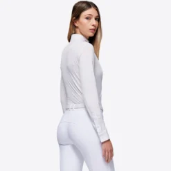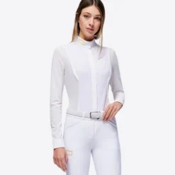 Women’s RG Mesh Long Sleeve Competition Shirt has classic, elegant style plus amazing ventilation and athletic function. RG Rider’s Gene from Cavalleria Toscana offers fresh and modern designs in premium fabrics. Unique brand accents, a flattering fit, and smart features are all part of the RG look. The Mesh Competition Shirt comes in two versions, with a white logo rectangle on the collar or with a yellow/orange logo rectangle on the collar.