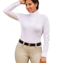 Sofia Show Shirt from RJ Classics is made with a lightweight fabric that wicks moisture, dries fast and has UPF30 sun protection. Riders will stay cooler and drier while protecting their skin on long show days. The modern zipper placket with snap collar has a crisp, clean look. For more competition options, like dressage and 3-Day Eventing, the Sofia Show Shirt has a stock tie loop. The easy fit, stretch, and soft fabric guarantee comfort. Find the show jacket, breeches, belt, and more to go with your RJ Classics Sofia Show Shirt at Mary’s!