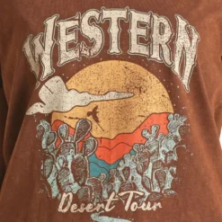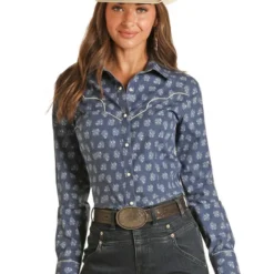 Rock & Roll Denim Retro Cactus Shirt is built for fun with a 4-snap front. The shorter length works really well with high rise jeans and shorts. Ladies Western top has patch pockets, a spread collar, and a unique print of desert scenery in blacklight shades. R&R Dale Brisby Retro Cactus casual cowgirl shirt has a bit of spandex and a roomy fit so you’ll definitely be ready to relax.