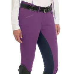 Romfh’s silky smooth Softtouch micro-PU fabric is a technical material that is stretchy, moisture wicking, and quick drying. The vertical stretch suede seat has a luxurious, light, comfortable feel and the darker colors won’t show saddle stains. Romfh ladies front zip dressage breeches have hand pockets in front that lay flat. The stretch material lower leg allows a close fit under your dress boots.