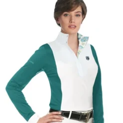 The Schuyler offers impressive cooling power, odor control, athletic stretch, and wonderfully light fabric. The sleeves have fine mesh underneath for ventilation. The front panel is smooth, solid white and the collar and cuffs are crisp white woven fabric lined with a print. The rest of the shirt is breathable mesh in a Romfh signature color. Women’s long sleeve show shirt is perfect for long, hot days at shows.