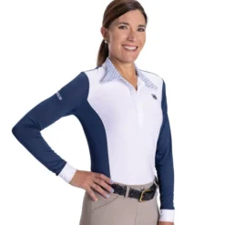 Romfh Signature Long Sleeve Show Shirt is a smart choice for looking polished in the show ring while staying cool and comfortable. Romfh Equestrian Signature Show Shirt is a long sleeve wrap collar shirt with custom Cool-touch microfiber fabric with Chill-factor. Chill-factor is a fabric technology that cools the skin when the rider heats up and perspires, plus it offers UPF40 protection.