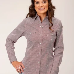 Roper Climbing Diamond Print Shirt has a crisp pattern in red and white plus classic snap shirt styling and slimming fit. Close fitting Western riding shirt has a bit of spandex so riders can move easily in comfort. The unique Climbing Diamond Print Shirt from Roper is perfect for horse showing and ranch competitions.