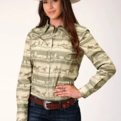 Unique yet classic Roper Cowboy Horizontal Print Shirt has an authentic cattle and cowboys motif in neutral tan and khaki. The print has a reverse/photo negative that makes it even more interesting. The lightweight cool cotton and the traditional Western style is perfect for everyday wear or competition.