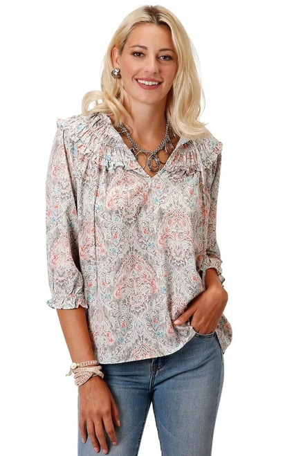 Roper Shirred Ruffle Collar Top has a romantic vibe with its dramatic collar and loose, flowy fit. The beautiful floral paisley print in brown, aqua, and coral colors is subtle and soft, making it easy to pair with wardrobe favorites. The Shirred Ruffle Collar Top for women has half length sleeves with an elasticated ruffle cuff that enhances the poet blouse look.