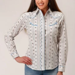This Roper Wallpaper Print Shirt manages to be fresh and retro with tons of charm and classic Western style. Ladies long sleeve snap shirt has light blue smile pockets and piping trim to accent the floral stripe print.