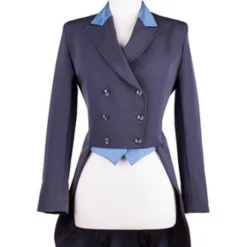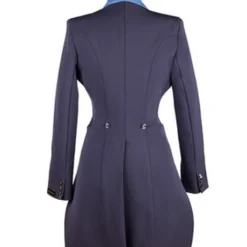 Sarm Hippique Marsina Dressage Shadbelly is a stunning formal dressage coat for sophistication and elegance in the show arena. Impeccably designed shadbelly for dressage showing has a fitted waist, tailored fit, and luxury details. The tails are lined with navy polyester and the tails have enough structure to achieve the perfect silhouette in the saddle. The classic Navy blue is accented with lighter blue microsuede collar and vest points or a black collar and vest points that gives the Marsina custom style. The points are stitched on. Buttons are dark colored with the Sarm Hippique horse logo in a tone-on-tone design. As traditional as the Sarm Hippique Marsina Shadbelly looks, you’ll be glad to know the material is thoroughly modern for athletic performance. The double stretch microfiber is breathable, comfortable, keeps its shape beautifully, and is water-resistant. This is a coat that will make you feel polished and professional as well as comfortable.