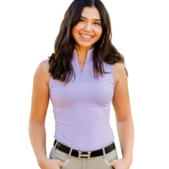 Ladies Quinn Lite Sleeveless Shirt from TKEQ the shop will keep you cool on hot days with the LITE technical fabric that breathes, wicks, and has a wonderful silky feel. The sustainable materials with athletic function add up to a smart choice for equestrians. Hot weather is here, so enhance your riding comfort with the Violet Edit Limited Edition Quinn Lite Sleeveless Shirt from TKEQ.