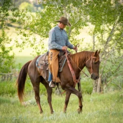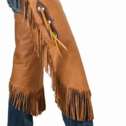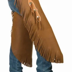 Weaver Leather’s chinks are a rugged brown or vintage shade leather with cut-in fringe along the legs. Leg scallops have 3 stainless steel conchos with ties on each leg. Chinks fasten in back with a strap and buckle and adjust in front with leather ties. Adjustable leg straps ensure a good fit. Shorter length Western chaps are perfect for ranch chores and riding, protecting your legs without getting in the way. Weaver Leather # 65-3294 and # 65-3703