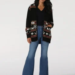 Cozy up with the Wrangler Bronc Zip Cardigan, a chic knit sweater that’s big on style. Gorgeous Southwest/Western patterned sweater in rich colors will complement so many things in your closet. The mid-thigh length sweater is so easy to slip on for instant warmth and chic style, adding fresh flair to your favorite outfits.