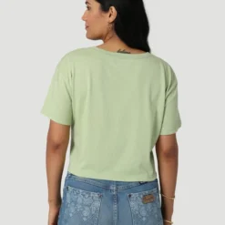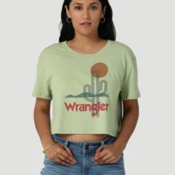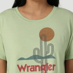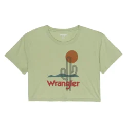 The Women’s Wrangler Cactus Crop Tee is super cute and all about summer comfort and fun. The color is Reseda, a light and refreshing herbal green that’s the perfect setting for a mod graphic of a cactus, mountain, sun, and bold red Wrangler logo. Ladies Western style T-shirt pairs easily with high-waisted jeans and shorts for a modern-retro vibe.