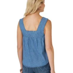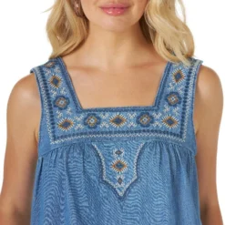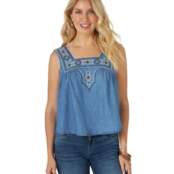 Easy breezy Wrangler Embroidered Tank has a cropped babydoll shape with wide shoulder straps and square neckline. The soft denim color is the perfect backdrop for elegant Southwestern embroidery in dark gold, cream, and blue. Adorable little ranch wear top will fit right in with your favorite jeans and shorts and Western boots or sandals.